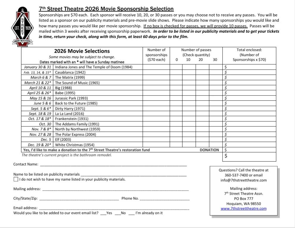 Not a business? Hey, that’s no problem. Since we’ve started showing classic movies, we’ve had many individuals sponsor a movie and share the free passes with friends. (Great idea for a birthday!) The price is reasonable — only $70 per sponsorship through movies screening through 2025.